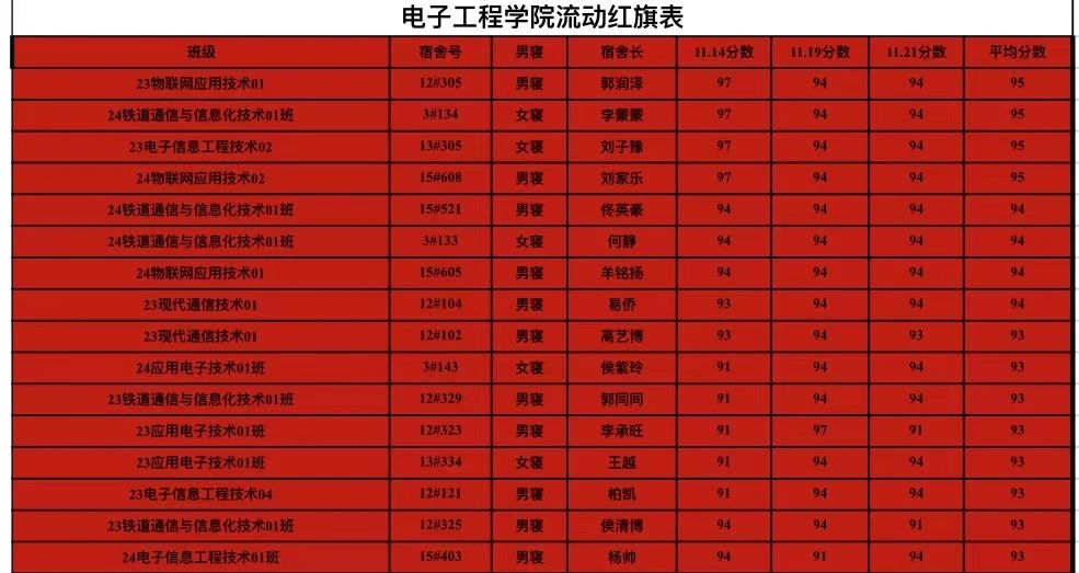為不斷進(jìn)一步增強(qiáng)電子工程學(xué)院學(xué)子們的衛(wèi)生意識(shí)和文明素養(yǎng),展現(xiàn)良好的校園形象,電子工程學(xué)院于2024年11月25日開展了“流動(dòng)紅旗”評(píng)比活動(dòng)。其中黨總支書記王正偉、學(xué)生支部書記李玲玲對(duì)上周優(yōu)秀宿舍頒發(fā)流動(dòng)紅旗,各班級(jí)班長(zhǎng)、團(tuán)支書、學(xué)院生活部參與本次頒發(fā)儀式